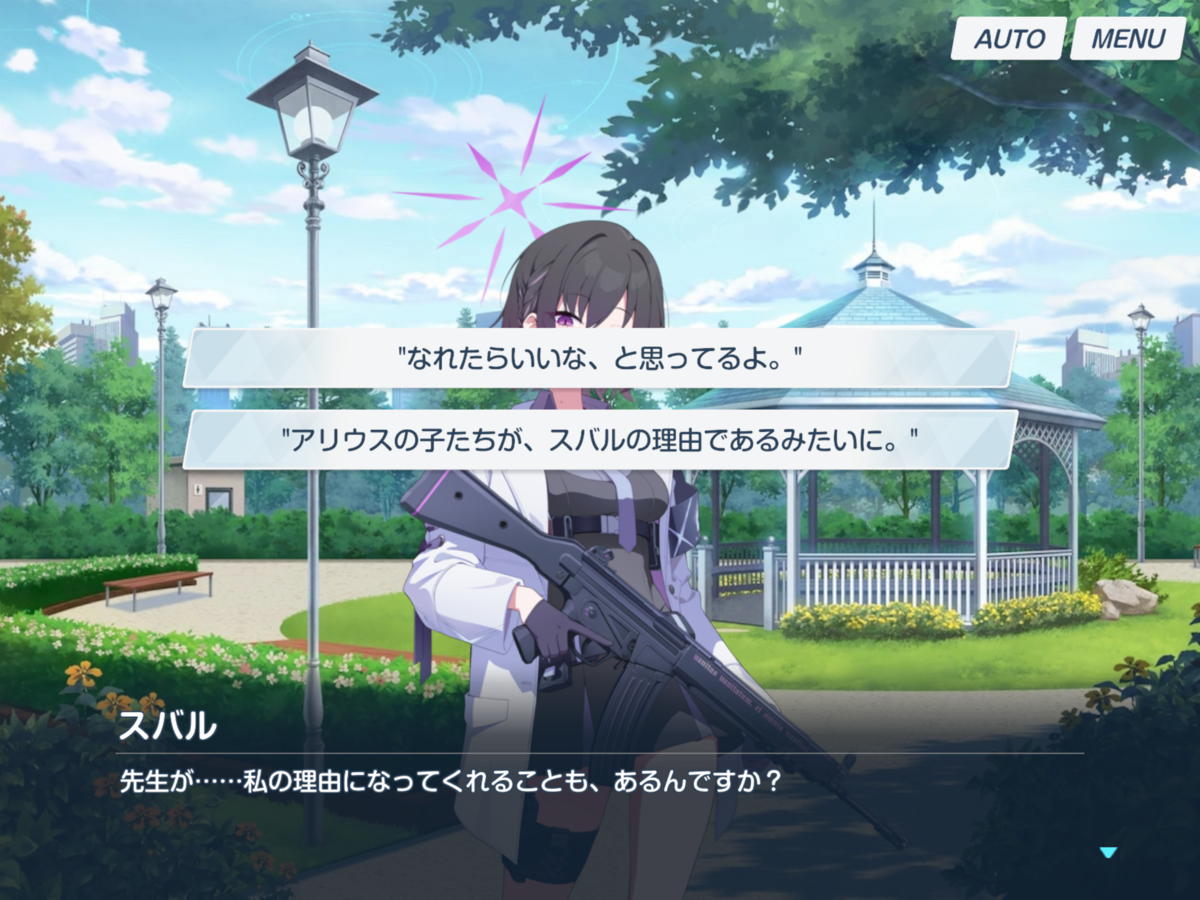 挟まれるアリウス生徒の健気さに胸を締め付けられつつ、少し手の空いた時間で先生とスバルは初めて1対1で会話します